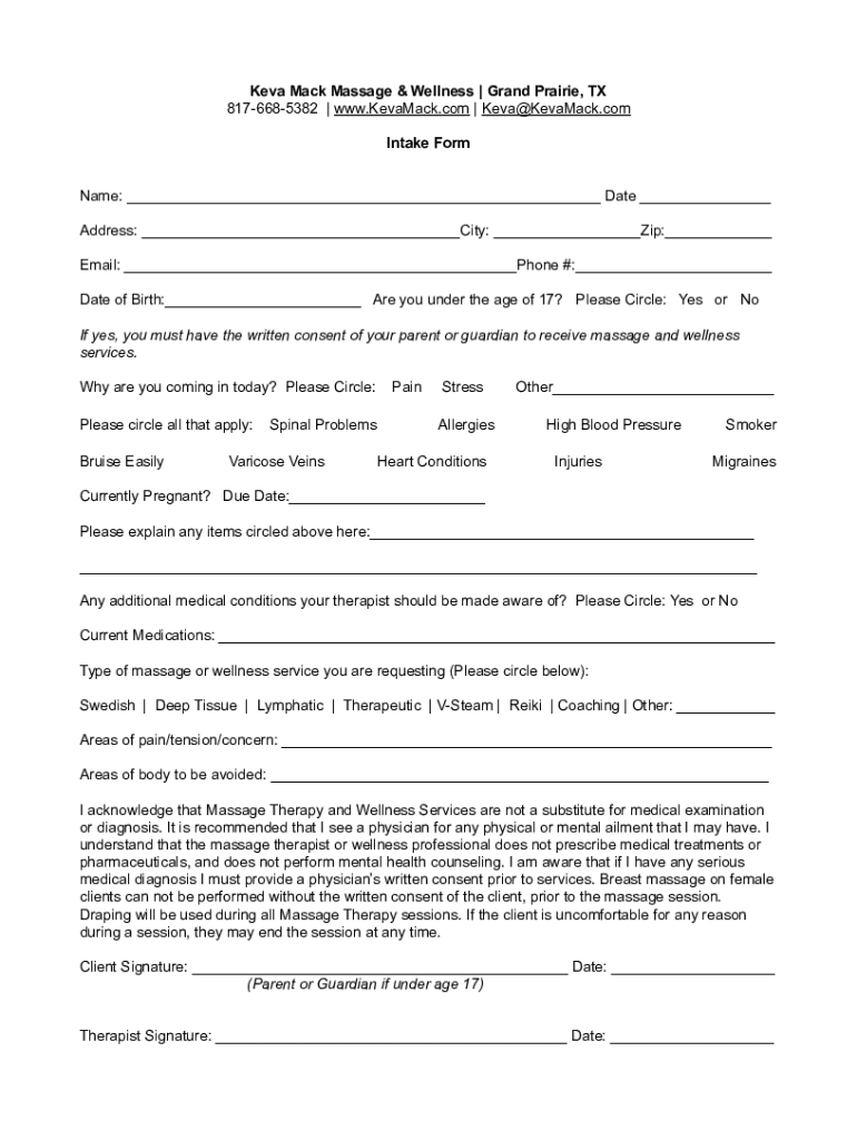 Neva Mack Massage & Wellness | Grand Prairie, TX 8176685382 | www.KevaMack.com | Keva@KevaMack.com Intake Form Name: ___ Date ___ Address: ___City: ___Zip:___ Email: ___Phone #:___ Date of Birth:___