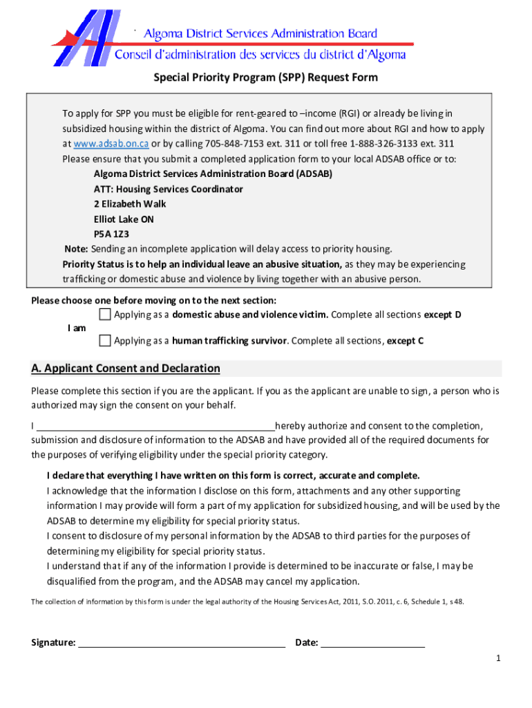 Special Priority Program (SPP) Request Form To apply for SPP you must be eligible for rent geared to income (CGI) or already be living in subsidized housing within the district of Alma. You can find