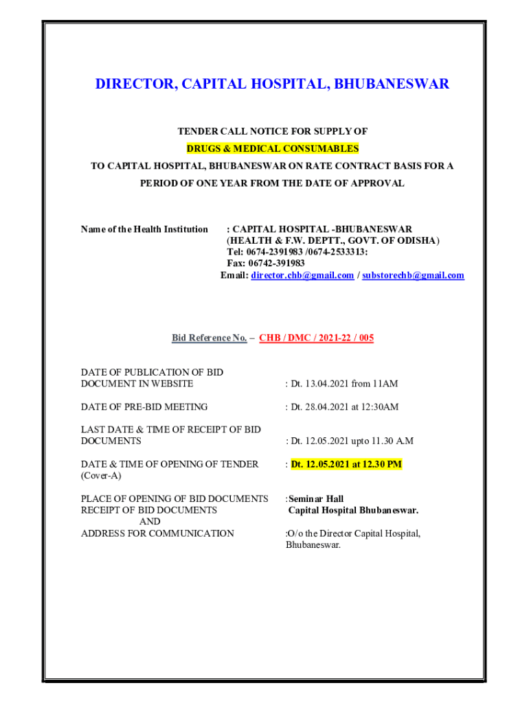 DIRECTOR, CAPITAL HOSPITAL, BHUBANESWAR TENDER CALL NOTICE FOR SUPPLY OF DRUGS & MEDICAL CONSUMABLES TO CAPITAL HOSPITAL, BHUBANESWAR ON RATE CONTRACT BASIS FOR A PERIOD OF ONE YEAR FROM THE DATE