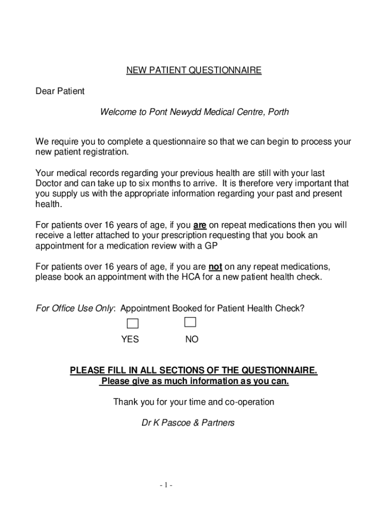 NEW PATIENT QUESTIONNAIRE Dear Patient Welcome to Point New Medical Center, North We require you to complete a questionnaire so that we can begin to process your new patient registration. Your medical