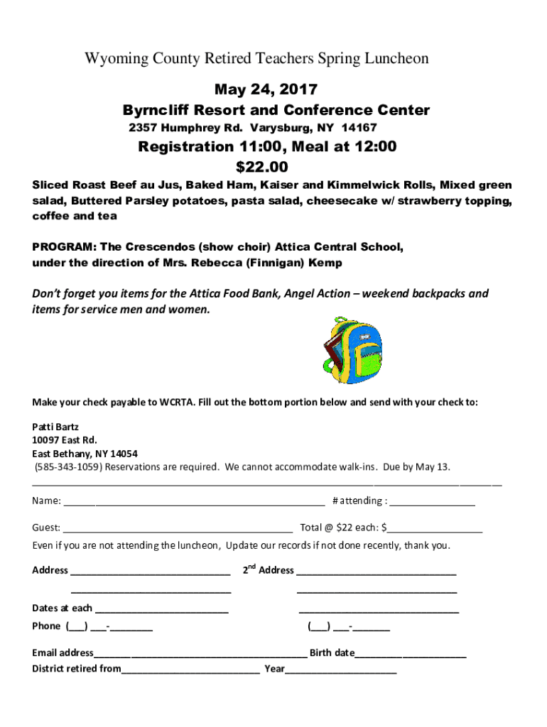 Wyoming County Retired Teachers Spring Luncheon May 24, 2017, Byrncliff Resort and Conference Center 2357 Humphrey Rd. Augsburg, NY 14167Registration 11:00, Meal at 12:$0022.00 Sliced Roast Beef Au