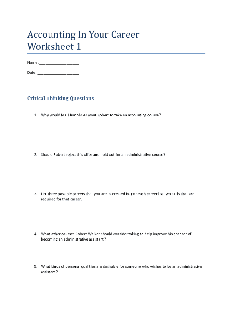 Accounting In Your Career Worksheet 1 Name: ___ Date: ___Critical Thinking Questions 1. Why would Ms. Humphries want Robert to take an accounting course?2. Should Robert reject this offer and hold