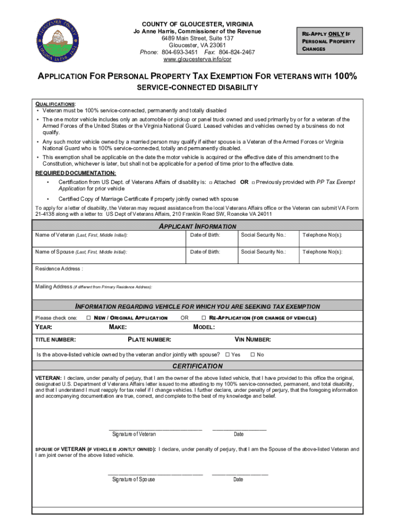 COUNTY OF GLOUCESTER, VIRGINIA Jo Anne Harris, Commissioner of the Revenue 6489 Main Street, Suite 137 Gloucester, VA 23061 Phone: 8046933451 Fax: 8048242467 www.gloucesterva.info/corREAPPLY ONLY