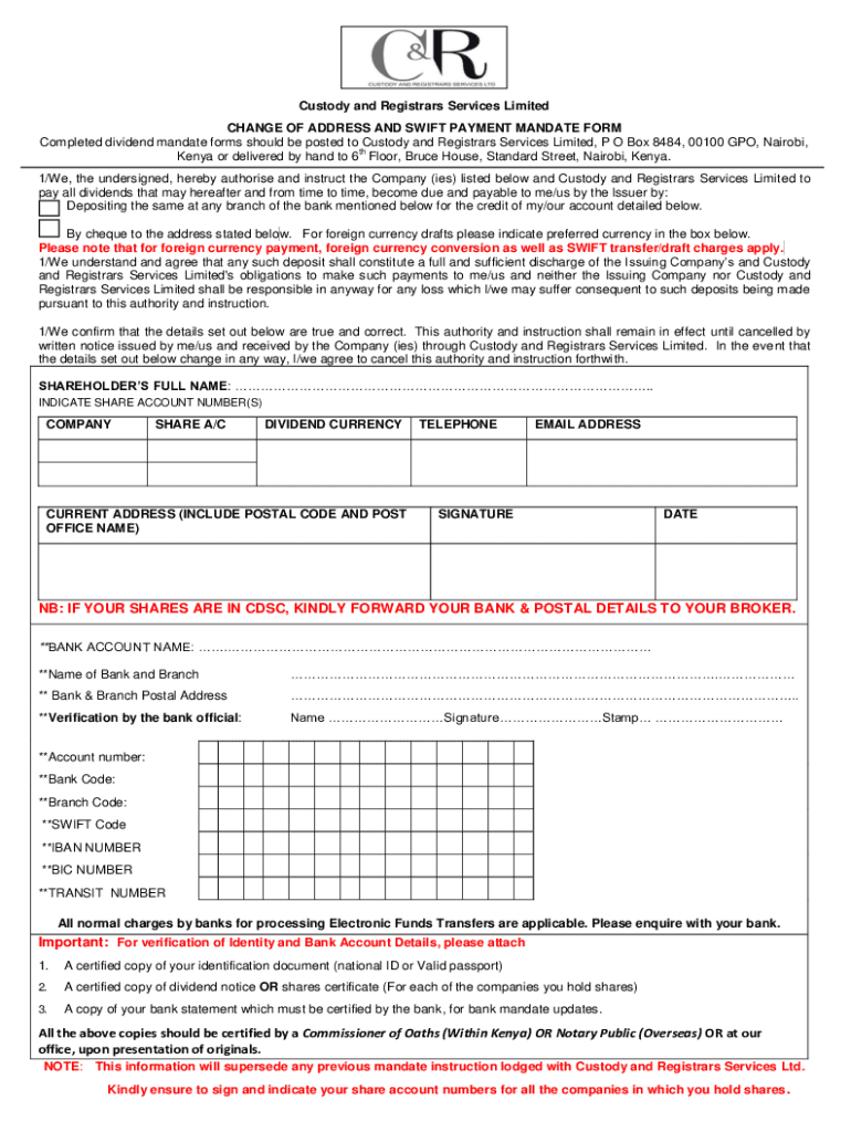 Custody and Registrars Services Limited CHANGE OF ADDRESS AND SWIFT PAYMENT MANDATE FORM Completed dividend mandate forms should be posted to Custody and Registrars Services Limited, P O Box 8484,