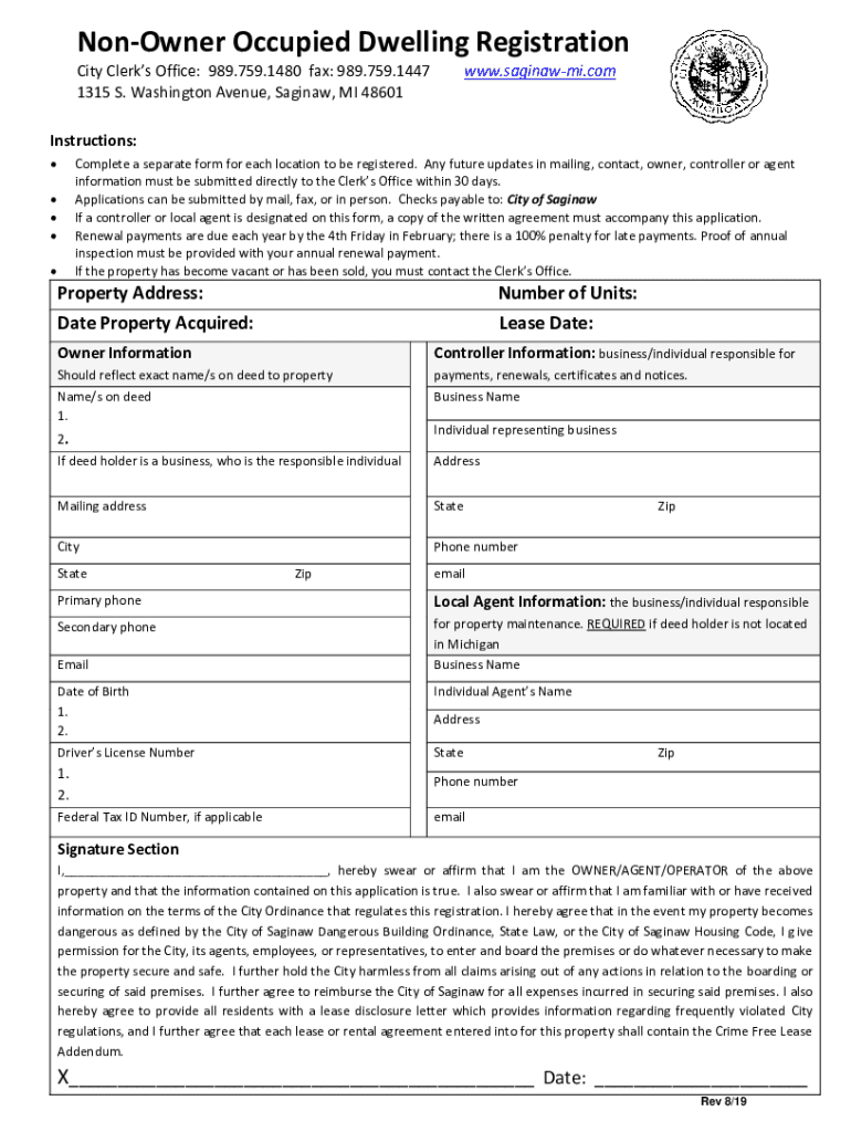 Owner Occupied Dwelling Registration City Clerks Office: 989.759.1480 fax: 989.759.1447 1315 S. Washington Avenue, Saginaw, MI 48601www. Saginaw.constructions: Complete a separate form for each location
