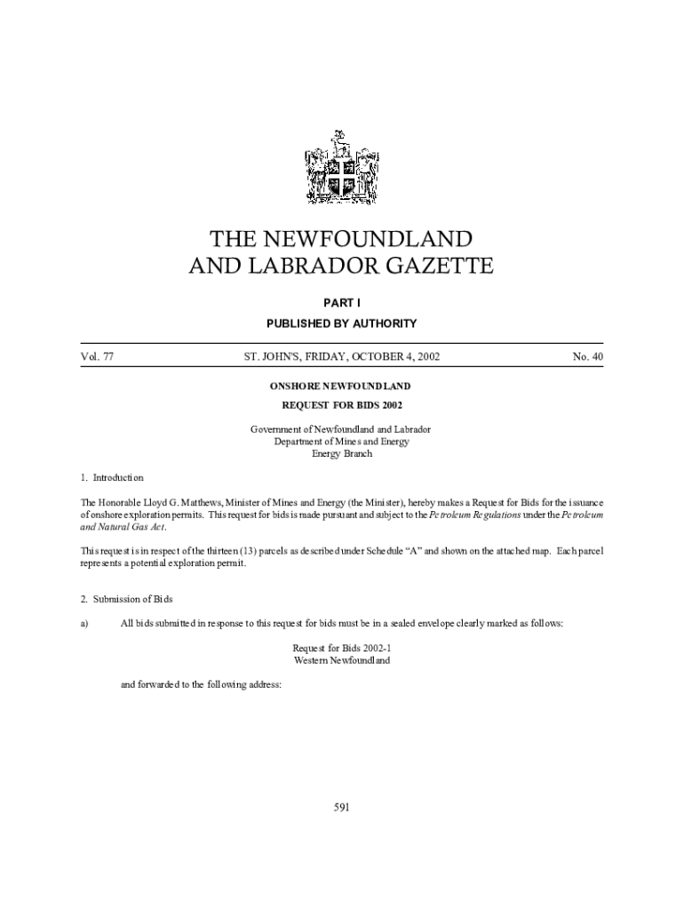 THE NEWFOUNDLAND AND LABRADOR GAZETTE PART I PUBLISHED BY AUTHORITY Vol. 77ST. JOHN\'S, FRIDAY, OCTOBER 4, 2002No. 40ONSHORE NEWFOUNDLAND REQUEST FOR BIDS 2002 Government of Newfoundland and Labrador
