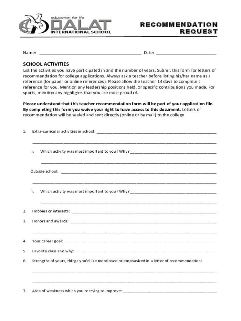 Get the free RECOMMENDATION REQUEST - Dalat International School