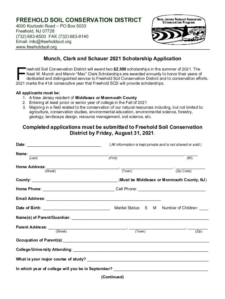 FREEHOLD SOIL CONSERVATION DISTRICT 4000 Colossi Road PO Box 5033 Freehold, NJ 07728 (732) 6838500 FAX (732) 6839140 Email: info@freeholdscd.org www.freeholdsoil.orgMunch, Clark and Chaucer 2021 Scholarship