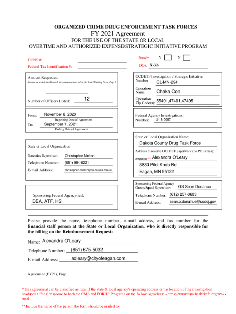ORGANIZED CRIME DRUG ENFORCEMENT TASK FORCES FY 2021 Agreement FOR THE USE OF THE STATE OR LOCAL OVERTIME AND AUTHORIZED EXPENSE/STRATEGIC INITIATIVE PROGRAM Rural×DUNS #:Amount Requested: Amount