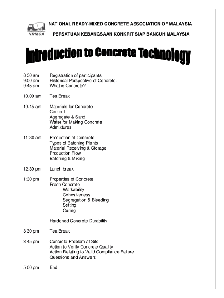NATIONAL REMIXED CONCRETE ASSOCIATION OF MALAYSIA PERSIAN KEBANGSAAN SANSKRIT SOAP BRANCH MALAYSIA8.30 am 9:00 am 9:45 registration of participants. Historical Perspective of Concrete. What is Concrete?10.00