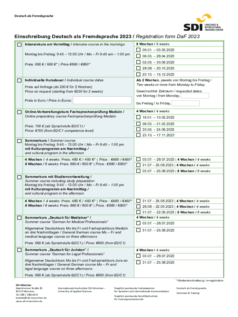 Deutsche ALS FremdspracheEinschreibung Deutsche ALS Fremdsprache 2023 / Registration form DAF 2023 Intensifiers am I Vomiting / Intensive course in the mornings8 When / 8 weeks 09.01. 03.03.2023Montag