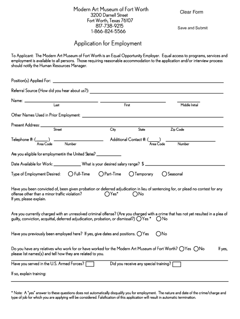 Modern Art Museum of Fort Worthier Form3200 Darnell Street Fort Worth, Texas 76107 8177389215 18668245566Save and SubmitApplication for Employment To Applicant: The Modern Art Museum of Fort Worth