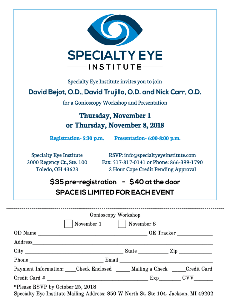 Specialty Eye Institute invites you to join David Begot, O.D., David Try Jill, O.D. and Nick Car r, O.D. for an Endoscopy Workshop and Presentation Thursday, November 1 or Thursday, November 8, 2018,