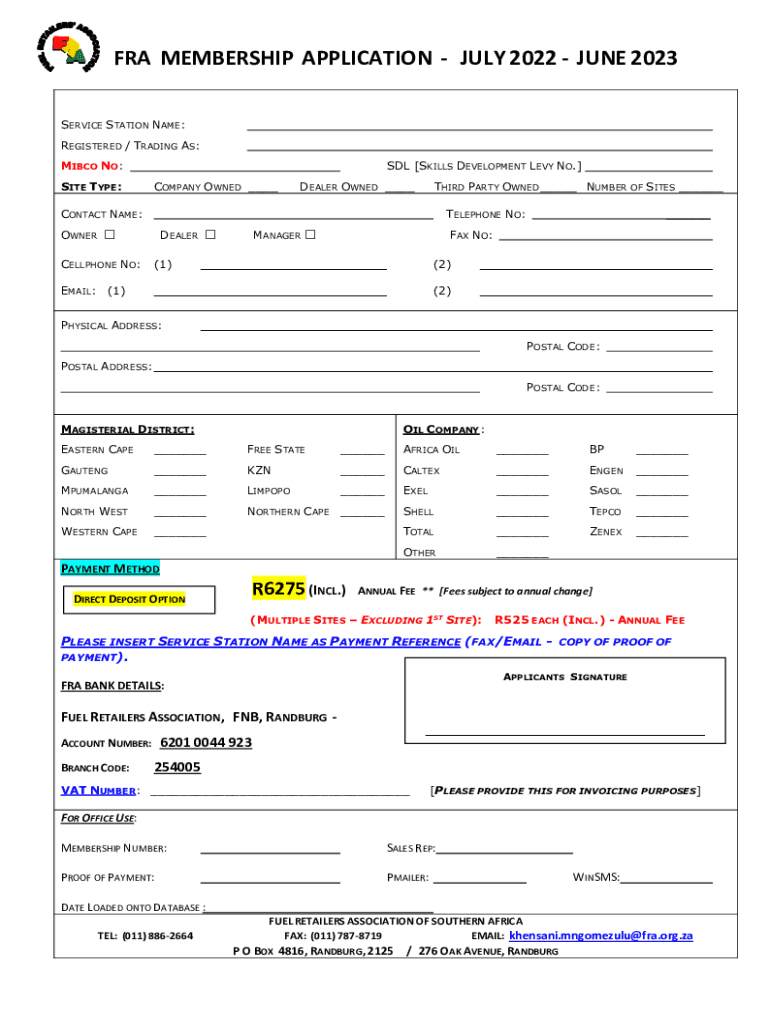 FRA MEMBERSHIP APPLICATION JULY 2022 JUNE 2023 SERVICE STATION NAME: REGISTERED / TRADING AS: MI BCO NO: SITE TYPE:SDL [SKILLS DEVELOPMENT LEVY NO.] COMPANY OWNED ___DEALER OWNED ___THIRD PARTY OWNED___