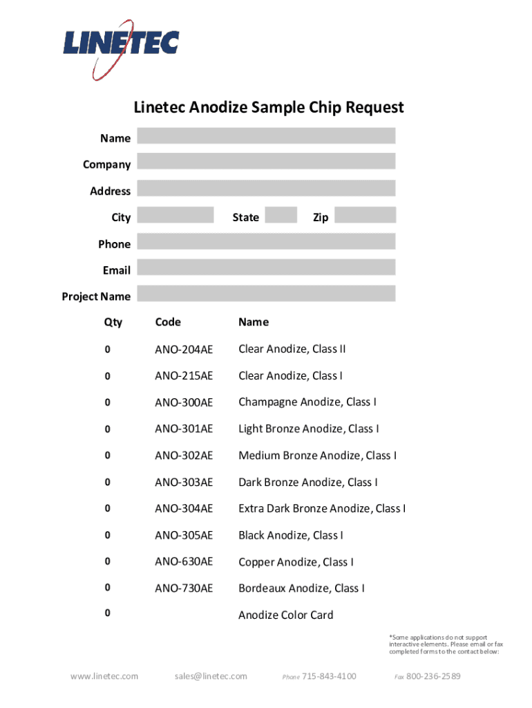 Kinetic Anodize Sample Chip Request Name Company Address StateCityZipPhone Email Project Name QtyCodeName0ANO204AEClear Anodize, Class II0ANO215AEClear Anodize, Class I0ANO300AEChampagne Anodize,