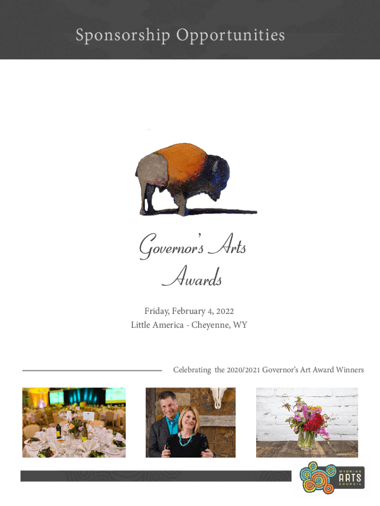 Sponsorship OpportunitiesGovernors Arts Awards Friday, February 4, 2022, Little America Cheyenne, Celebrating the 2020/2021 Governors Art Award Winners attends the Governors Arts Awards? The Governors