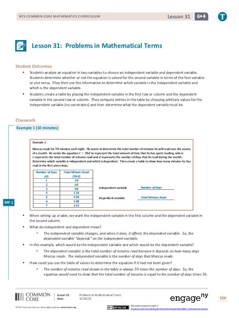 Lesson 31NYS COMMON CORE MATHEMATICS CURRICULUM64Lesson 31: Problems in Mathematical Terms Student Outcomes Students analyze an equation in two variables to choose an independent variable and dependent