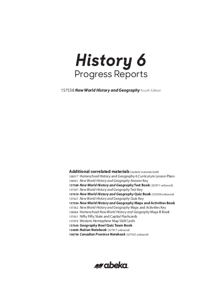 History 6Progress Reports 157538 New World History and Geography Fourth EditionAdditional correlated materials (student materials bold)168017Homeschool History and Geography 6 Curriculum Lesson Plans