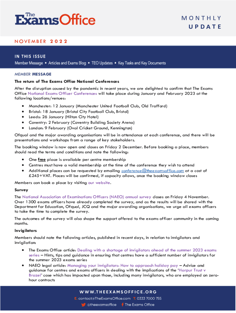 MONTHLY UPDATE NOVEMBER 2 0 2 2MEMBER MESSAGE The return of The Exams Office National Conferences After the disruption caused by the pandemic in recent years, we are delighted to confirm that The
