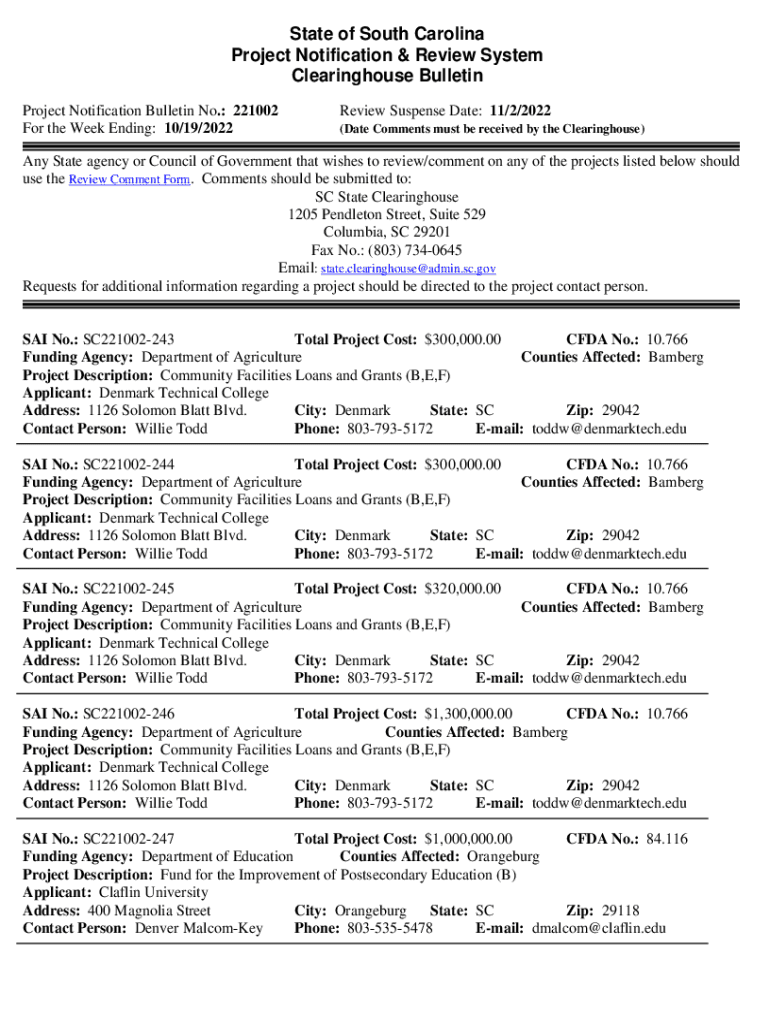 State of South Carolina Project Notification & Review System Clearinghouse Bulletin Project Notification Bulletin No.: 221002 For the Week Ending: 10/19/2022Review Suspense Date: 11/2/2022 (Date Comments