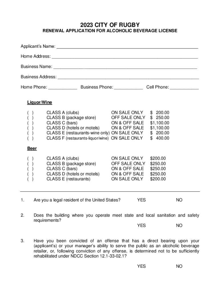2023 CITY OF RUGBY RENEWAL APPLICATION FOR ALCOHOLIC BEVERAGE LICENSE Applicants Name: ___ Home Address: ___ Business Name: ___ Business Address: ___ Home Phone: ___ Business Phone: ___ Cell Phone: