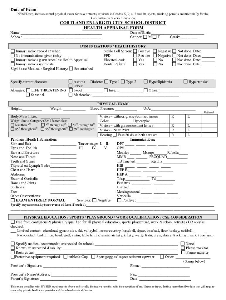 DateofExam:___ NYSEDrequiredanannualphysicalexamfornewentrants, studentsinGradesK,2,4,7and10,sports, workingpermitsandtrienniallyforthe CommitteeonSpecialEducationCORTLANDENLARGEDCITYSCHOOLDISTRICT
