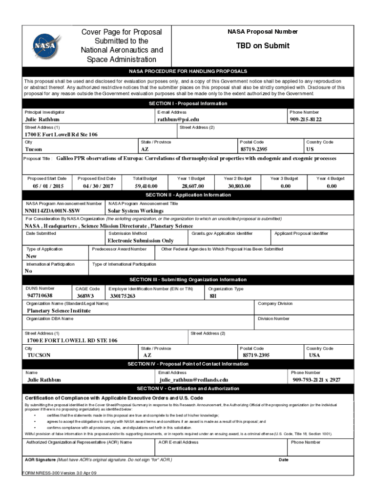 NASA Proposal Undercover Page for Proposal Submitted to the National Aeronautics and Space Administration TBD on Submit NASA PROCEDURE FOR HANDLING PROPOSALS This proposal shall be used and disclosed