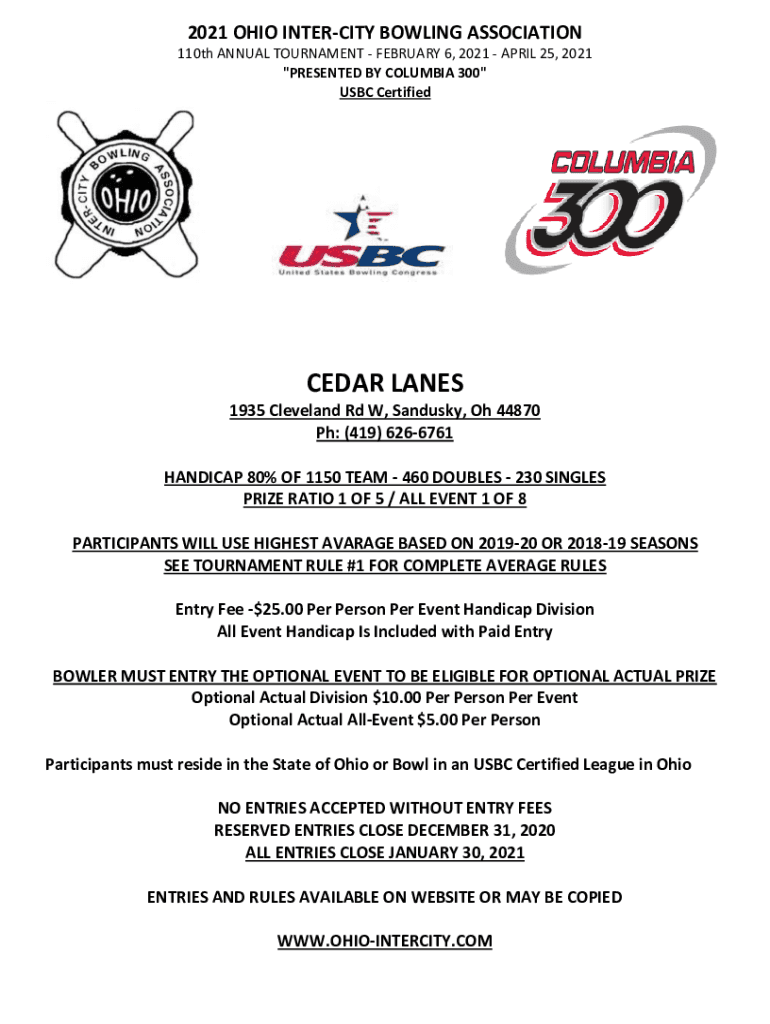 2021 OHIO INTERCITY BOWLING ASSOCIATION 110th ANNUAL TOURNAMENT FEBRUARY 6, 2021, APRIL 25, 2021 \” PRESENTED BY COLUMBIA 300\” USB CertifiedCEDAR LANES 1935 Cleveland Rd W, Sandusky, Oh 44870