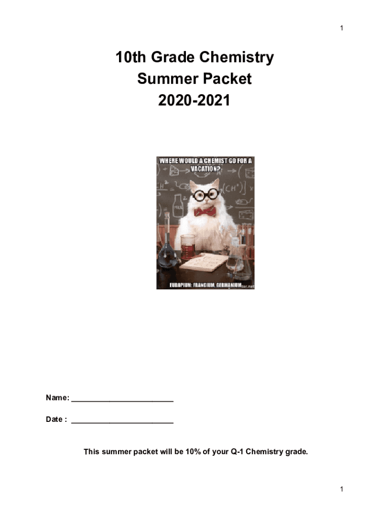 110th Grade Chemistry Summer Packet 20202021Name: ___ Date : ___This summer packet will be 10% of your Q1 Chemistry grade.1 Hello All! I would like to congratulate you all for the successful completion