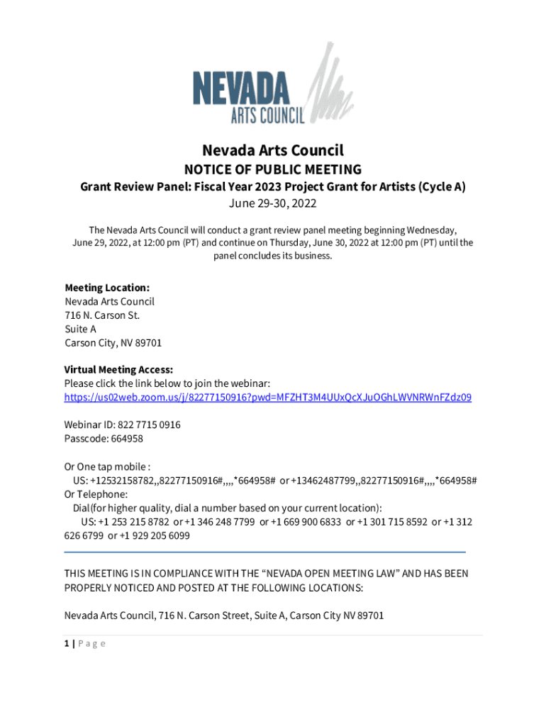Nevada Arts CouncilNOTICE OF PUBLIC MEETING Grant Review Panel: Fiscal Year 2023 Project Grant for Artists (Cycle A) June 2930, 2022 The Nevada Arts Council will conduct a grant review panel meeting