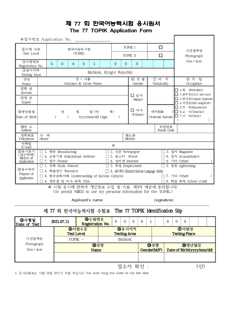 77 The 77 TOPIC Application Form Application No. Test Level (TOPIC) Registration No. Testing Area Name Korean00601TOPIK TOPIC II00(34)0Bishkek, Kerry Republic + Surname & Given Name Gender Male Englishman
