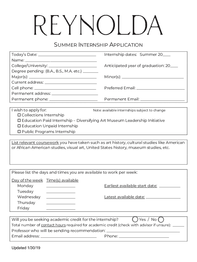 SUMMER INTERNSHIP APPLICATION Today's Date: ___ Name: ___ College/University: ___ Degree pending: (B.A., B.S., M.A. etc.) ___ Major(s): ___ Current address: ___ Cell phone: ___ Permanent address: