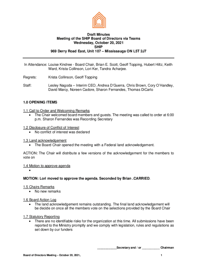 Draft Minutes Meeting of the SHIP Board of Directors via Teams Wednesday, October 20, 2021, SHIP 969 Derry Road East, Unit 107 Mississauga ON L5T 2J7In Attendance: Louise Kindred Board Chair, Brian