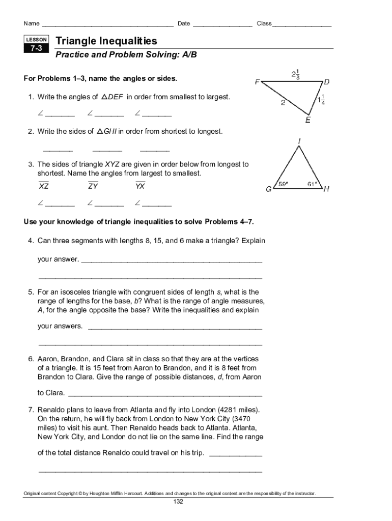 Name ___ Date ___ Class ___ LESSON73Triangle Inequalities Practice and Problem-Solving: A/For Problems 13, name the angles or sides. 1. Write the angles of ___ ___2. Write the sides of ___+DEF in