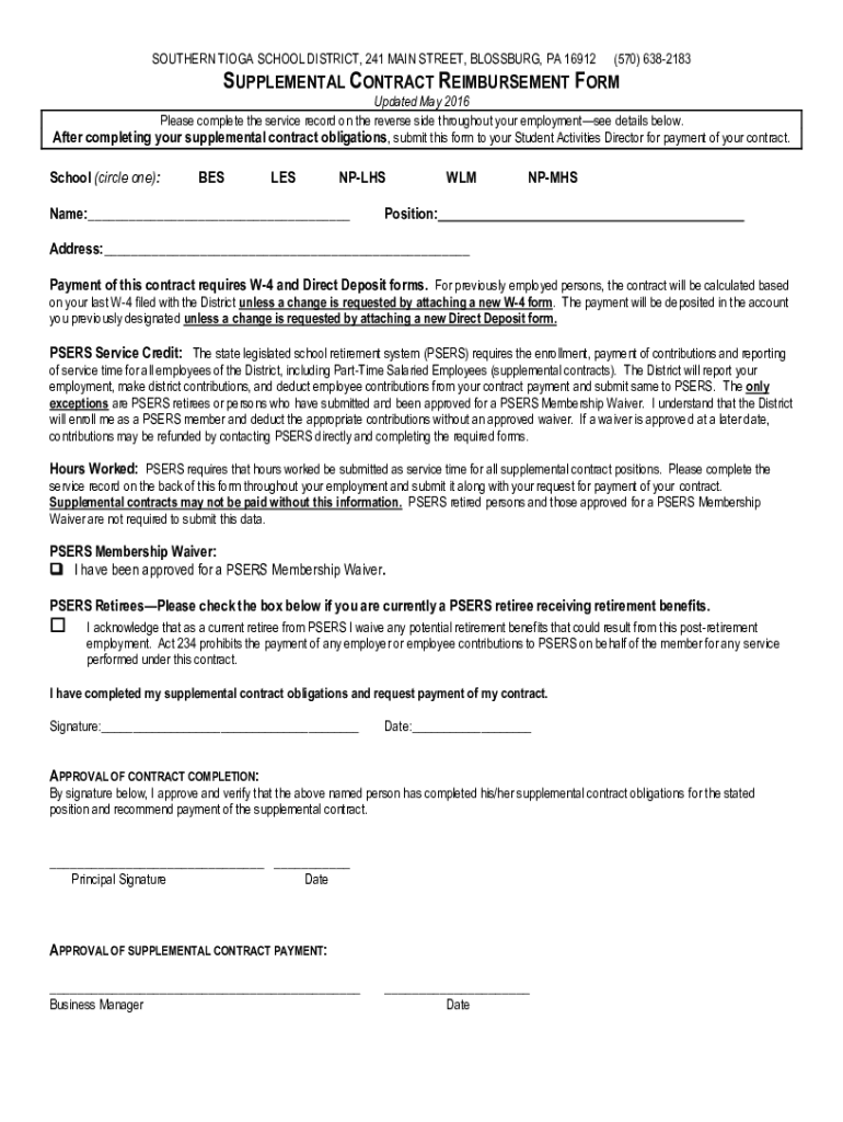 SOUTHERN TOGA SCHOOL DISTRICT, 241 MAIN STREET, BLOOMSBURG, PA 16912(570) 6382183SUPPLEMENTAL CONTRACT REIMBURSEMENT Formulated May 2016