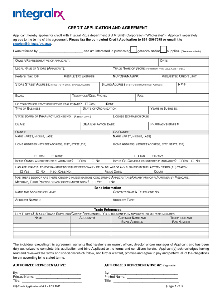 CREDIT APPLICATION AND AGREEMENT Applicant hereby applies for credit with Integral Rx, a department of J M Smith Corporation (Wholesaler). Applicant separately agrees to the terms of this agreement.