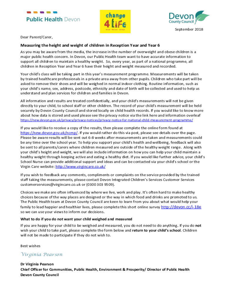 September 2018 Dear Parent/Carer, Measuring the height and weight of children in Reception Year and Year 6 As you may be aware from the media, the increase in the number of overweight and obese children