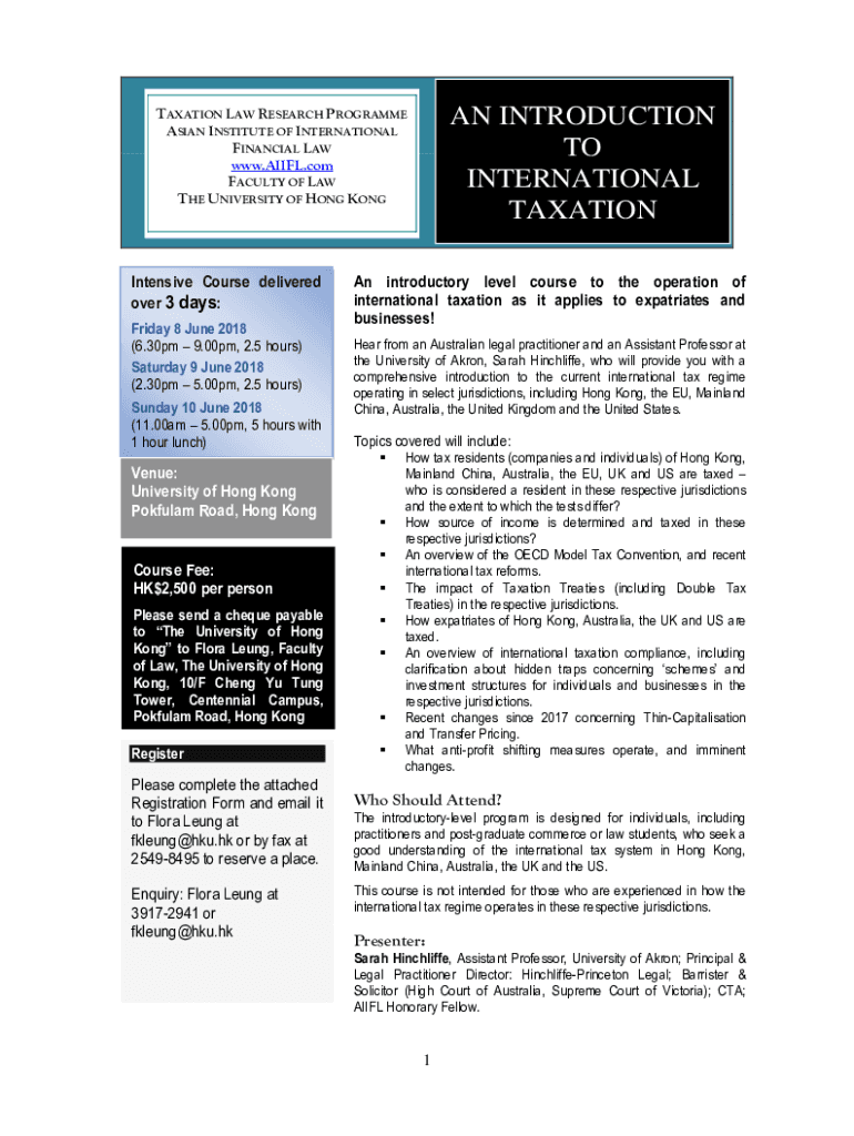 TAXATION LAW RESEARCH Program ASIAN INSTITUTE OF INTERNATIONAL FINANCIAL LAW www.AIIFL.com FACULTY OF LAW THE UNIVERSITY OF HONG KONGIntensive Course delivered over 3 days: Friday 8 June 2018 (6.30pm