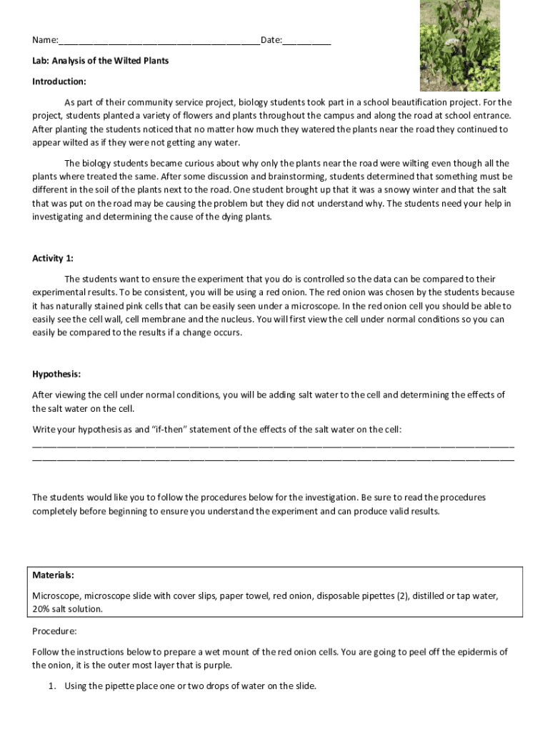 Name:___Date:___ Lab: Analysis of the Wilted Plants Introduction: As part of their community service project, biology students took part in a school beautification project. For the project, students