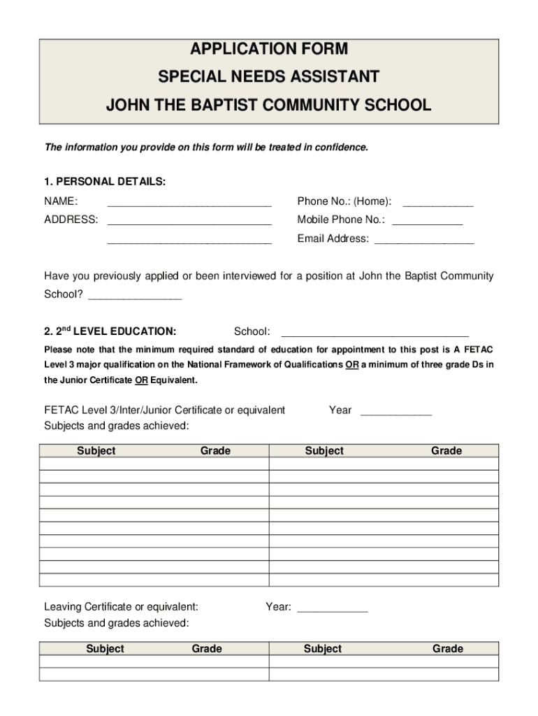 APPLICATION FORM SPECIAL NEEDS ASSISTANT JOHN THE BAPTIST COMMUNITY SCHOOL The information you provide on this form will be treated in confidence.1. PERSONAL DETAILS: NAME:___Phone No.: (Home):ADDRESS: