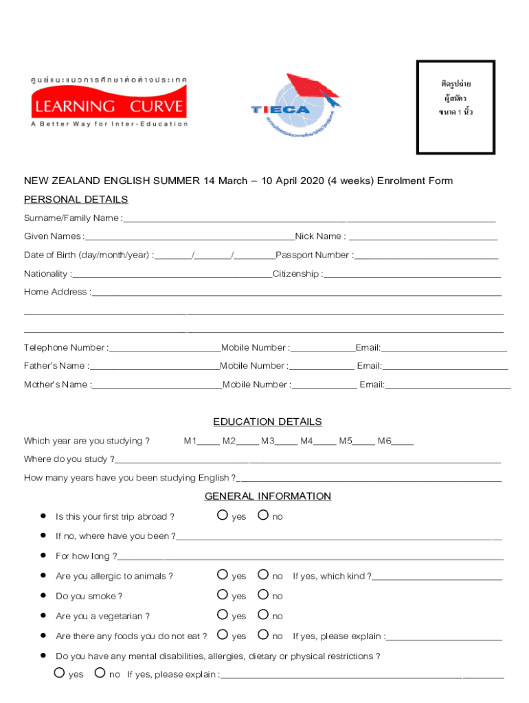 1 NEW ZEALAND ENGLISH SUMMER 14 March 10 April 2020 (4 weeks) Enrollment Form PERSONAL DETAILS Surname/Family Name :___ Given Names :___Nick Name : ___ Date of Birth (day/month/year) :___/___/___Passport