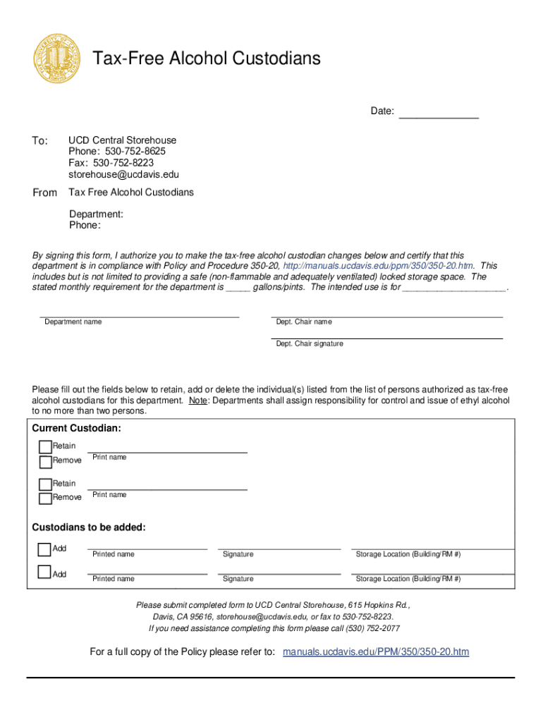 Three Alcohol Custodians Date:To:UCD Central Storehouse Phone: 5307528625 Fax: 5307528223 storehouse@ucdavis.eduFromTax Free Alcohol Custodians Department: Phone:By signing this form, I authorize