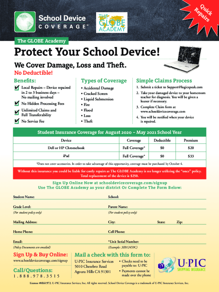 Q Re UIC pa k irate GLOBE AcademyProtect Your School Device! We Cover Damage, Loss and Theft. No Deductible! Benefits: 4 Local Repairs Device repaired q in 2 to 3 business days No mailing involved4