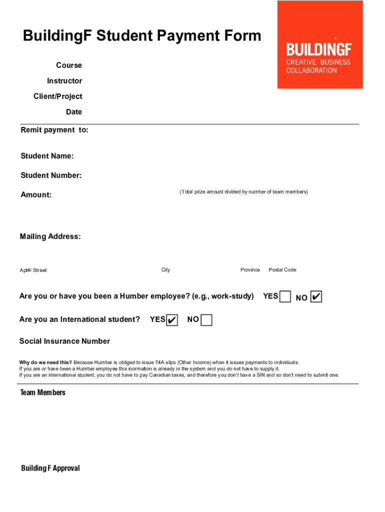Building Student Payment Form Course Instructor Client/Project Date Remit payment to: Student Name: Student Number: (Total prize amount divided by number of team members)Amount:Mailing Address:Apt#/