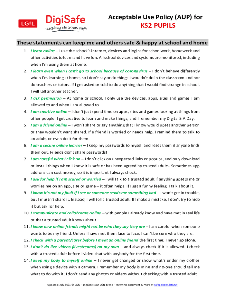 Acceptable Use Policy (AUP) forKS2 PUPILS These statements can keep me and others safe & happy at school and home 1. I learn online I use the schools' internet, devices and logins for schoolwork,
