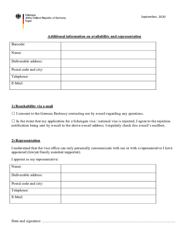 September, 2020Additional information on availability and representation Barcode: Name: Deliverable address: Postal code and city: Telephone: Email:1) Reach ability via email I consent to the German