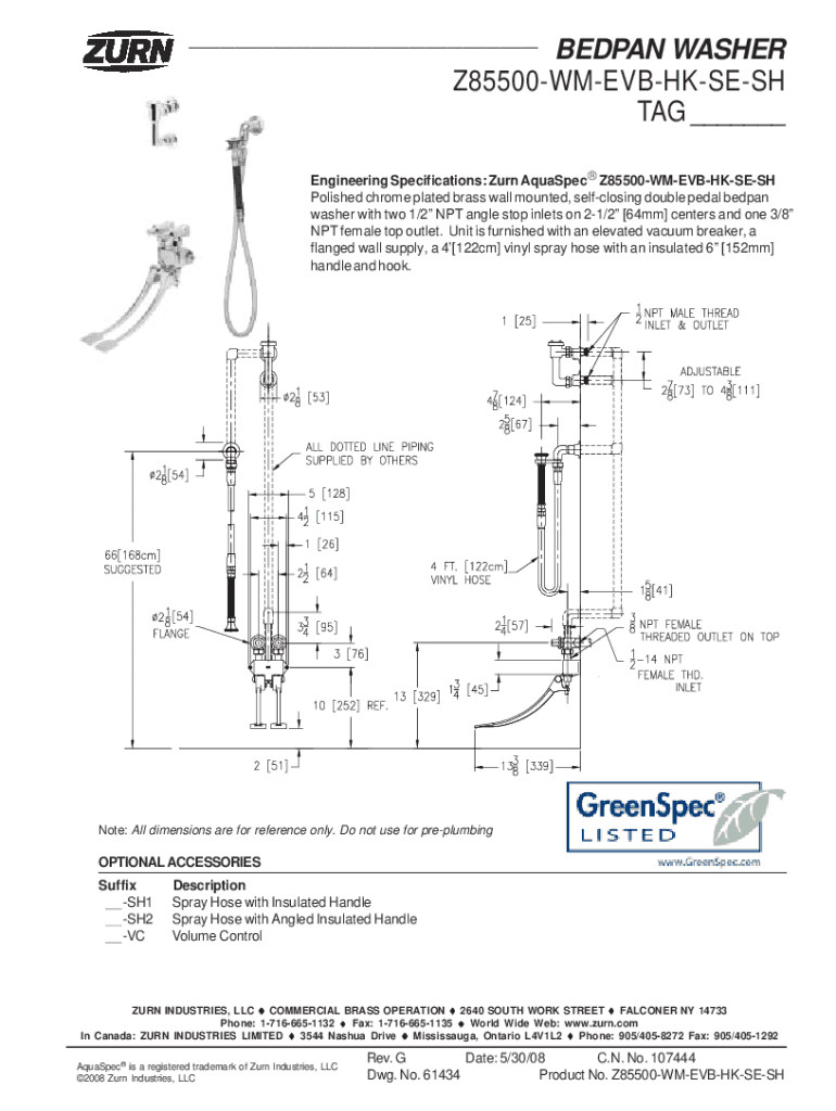 ___BEDPAN WASHER Z85500WMEVBHKSESH TAG ___Engineering Specifications: Turn Aquatic Z85500WMEVBHKSESH Polished chrome plated brass wall mounted, self-closing double pedal bedpan washer with two 1/2