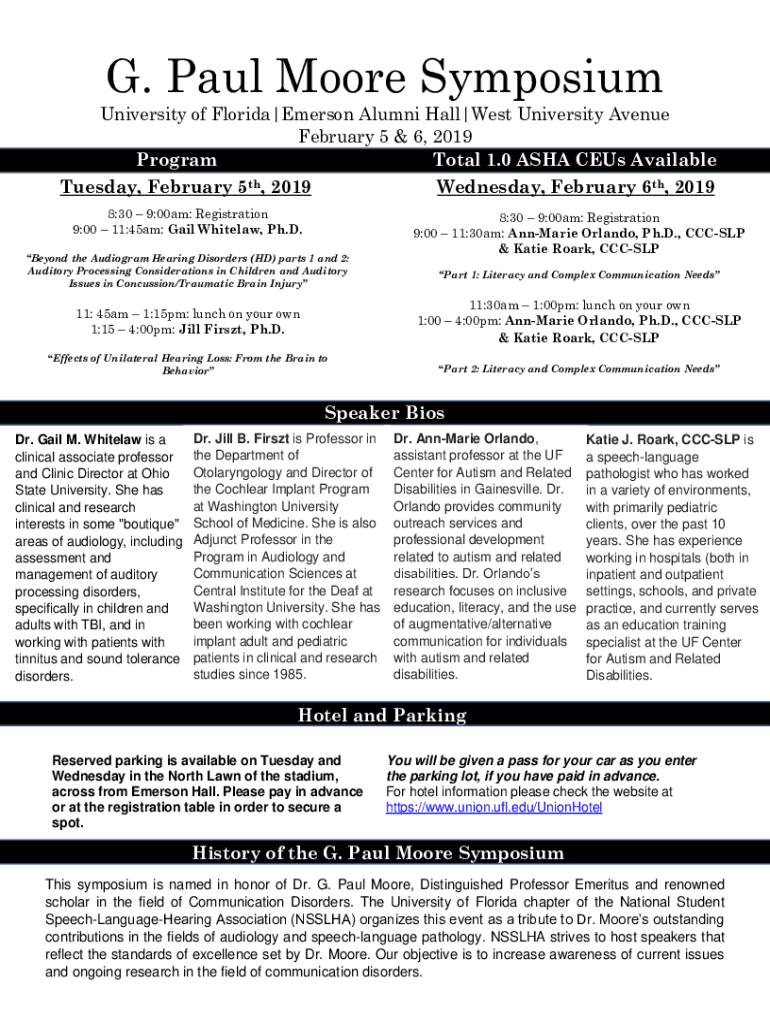 G. Paul Moore Symposium University of Florida|Emerson Alumni Hall|West University Avenue February 5 & 6, 2019 Program Total 1.0 ASHA Zeus Available Tuesday, February 5th, 2019Wednesday, February 6th,