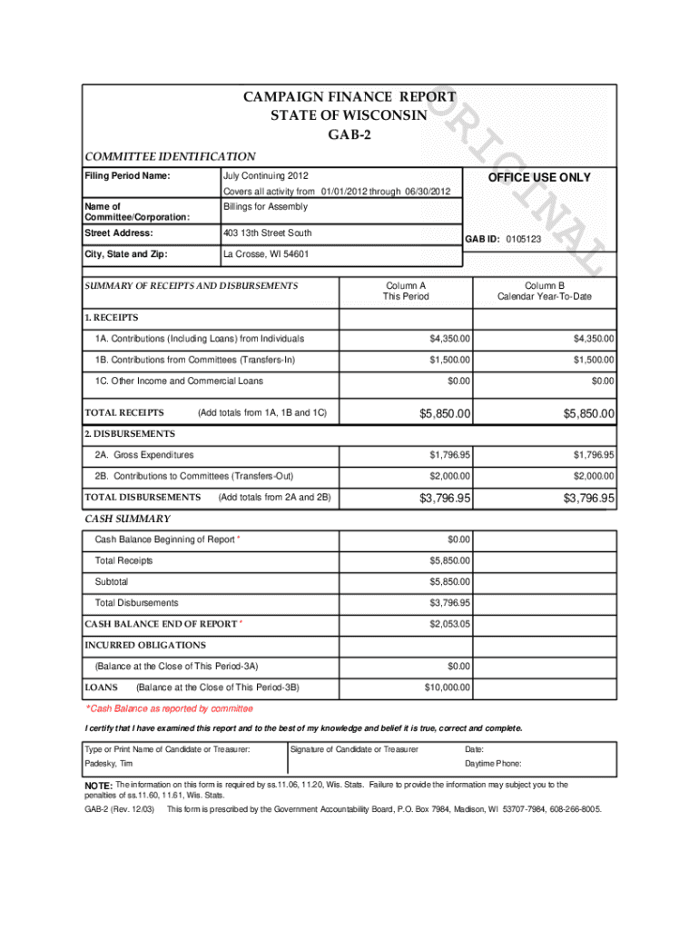 CAMPAIGN FINANCE REPORT STATE OF WISCONSIN GAB2 COMMITTEE IDENTIFICATION Filing Period Name:July Continuing 2012OFFICE USE Onlookers all activity from 01/01/2012 through 06/30/2012 Name of Committee/Corporation:Billings