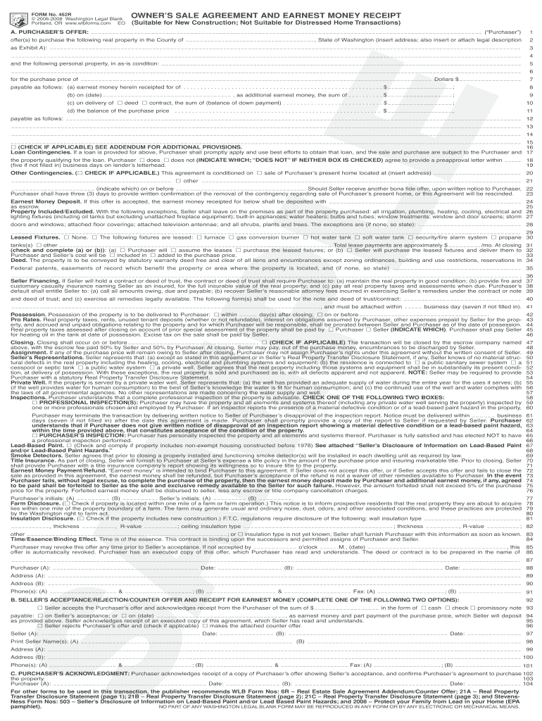 FORM No. 462R 20062008 Washington Legal Blank Portland, OR www.wlbforms.com OWNERS SALE AGREEMENT AND EARNEST MONEY RECEIPT (Suitable for New Construction; Not Suitable for Distressed Home Transactions)(Purchaser)A.